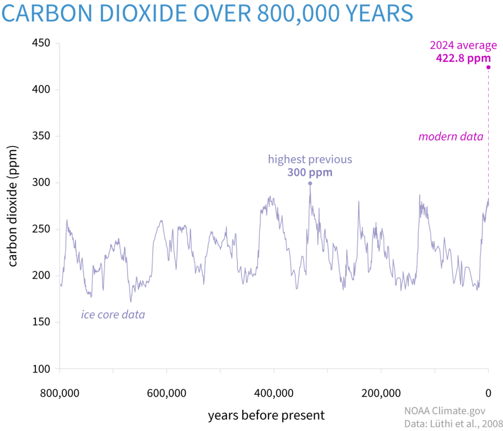 - In the 800,000-year record, CO₂ varied naturally between ~180–300 ppm. That pattern held until modern times.