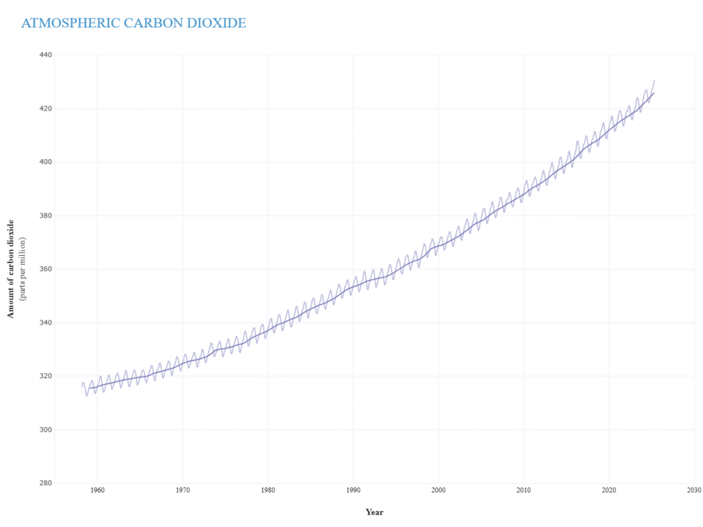 - In the modern record (1958 onward), the curve is no longer oscillating around a balance — it begins a steady, sharp upward deviation.